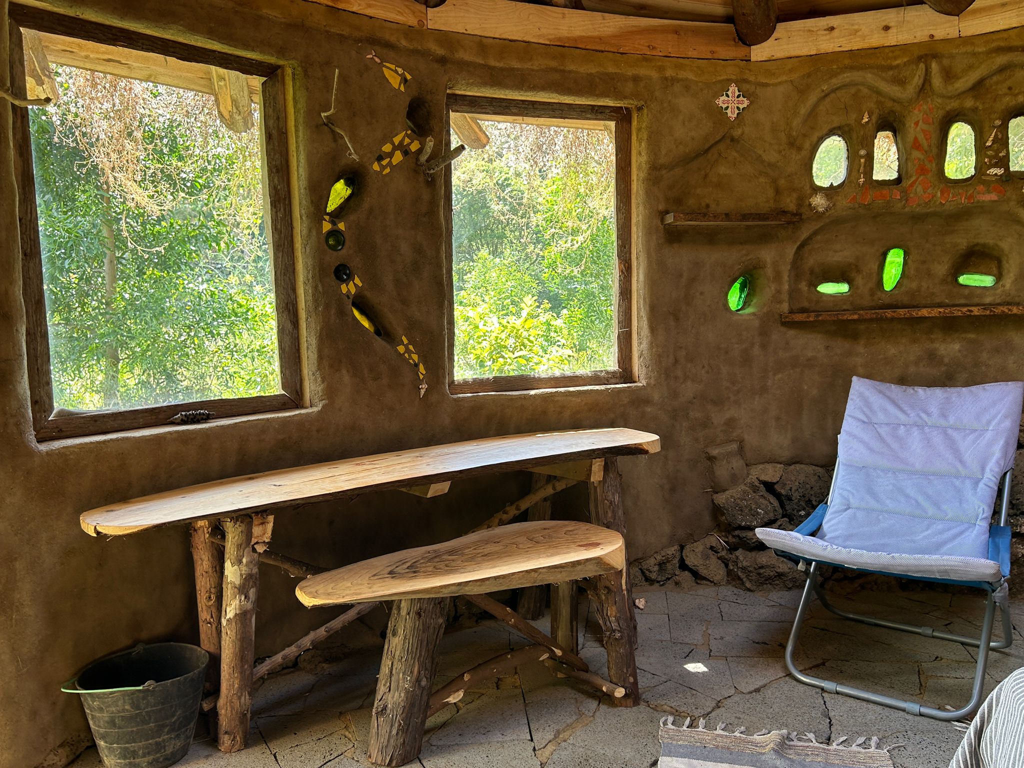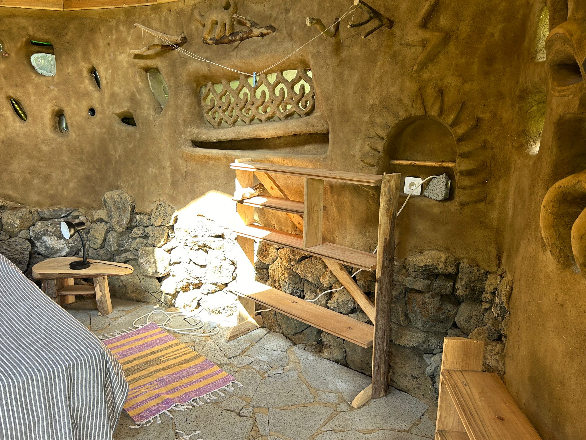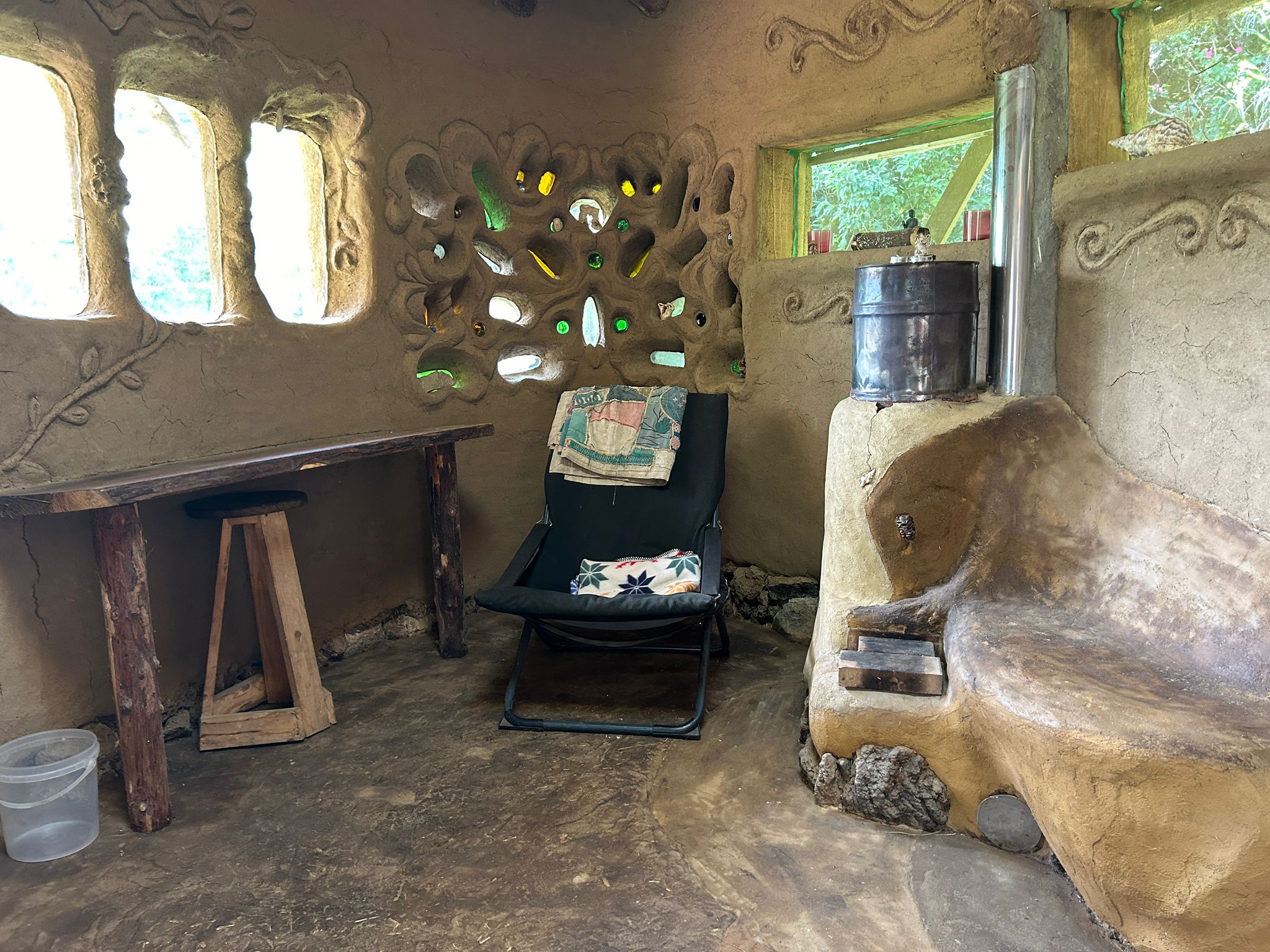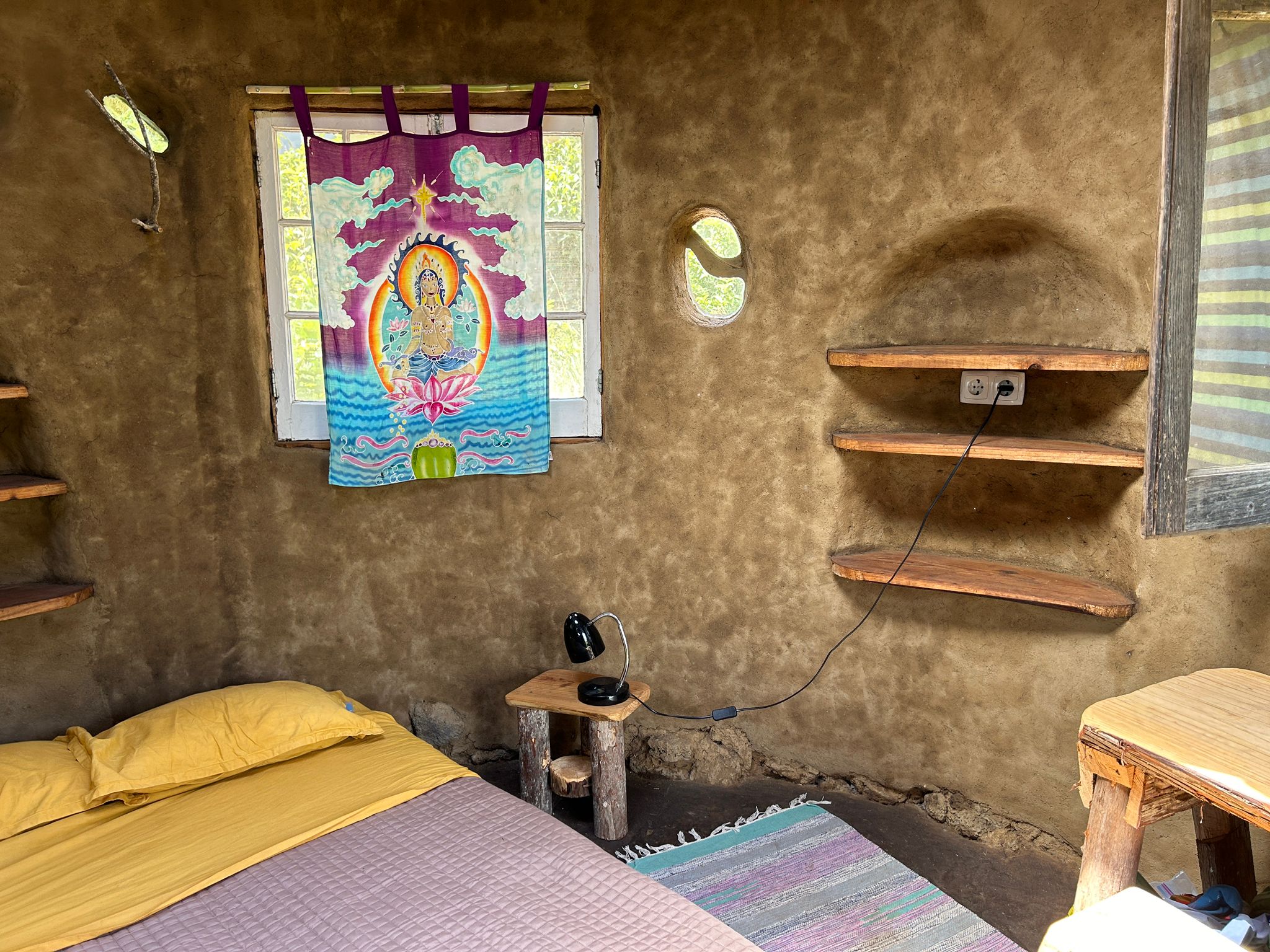 Each one is unique, beautiful and cozy with its own magic and personal details. They all come with a queen bed with bedding, a desk/table and stool or bench, electrical outlets, lights, night tables and shelves and hooks for your personal items. The Sunset bungalow has a wood-fired rocket heater and the Merkaba bungalow has a woodstove, for the wintertime. Sunrise bungalow has excellent passive solar heating due to its full day full sun exposure, ideal for cob wall thermal absorption duing the daytime hours and release in the evening and night hours. They all 3 have a sink on the outside of the building and outdoor seating. Long-term rentals (30 days or more) are 350€/ month for the Sunrise bungalow and 450€/month for the Sunset and Merkaba bungalows.