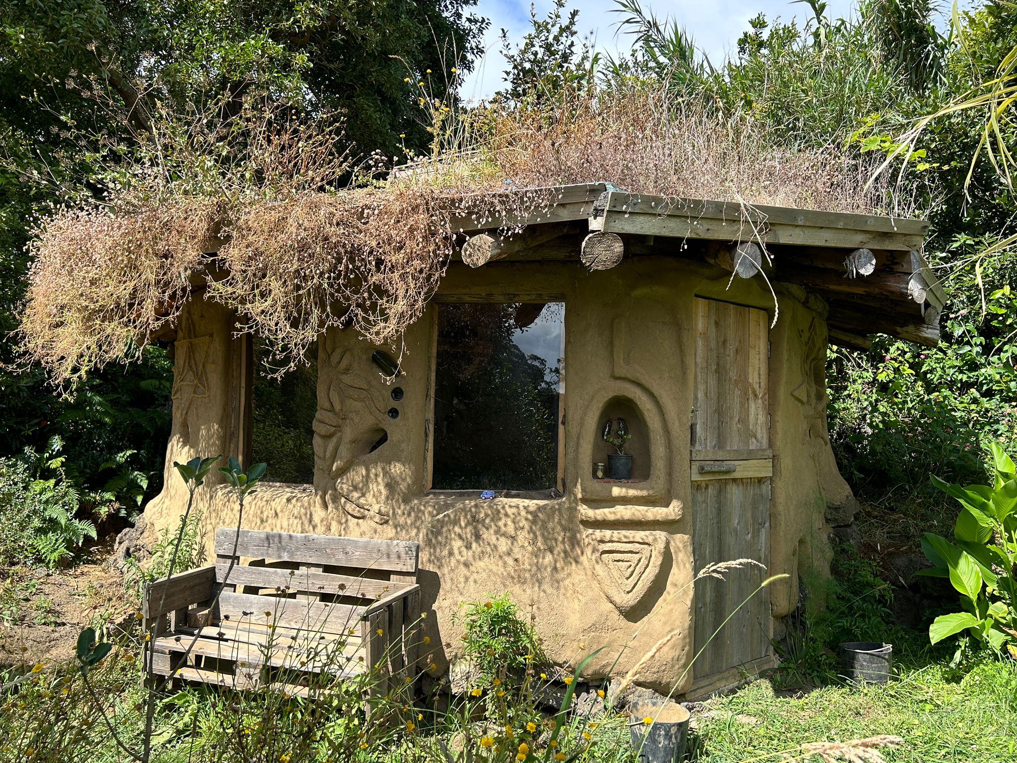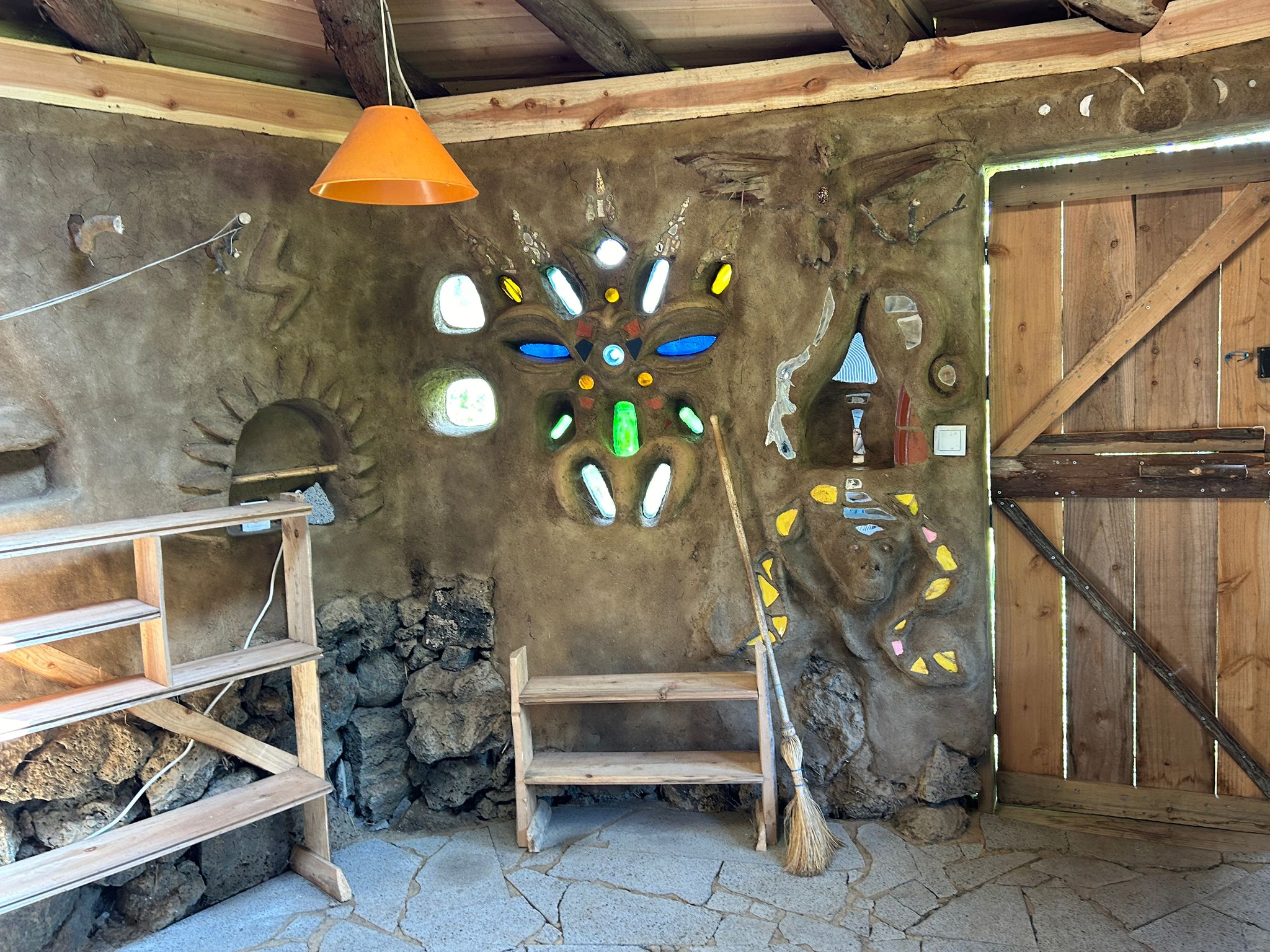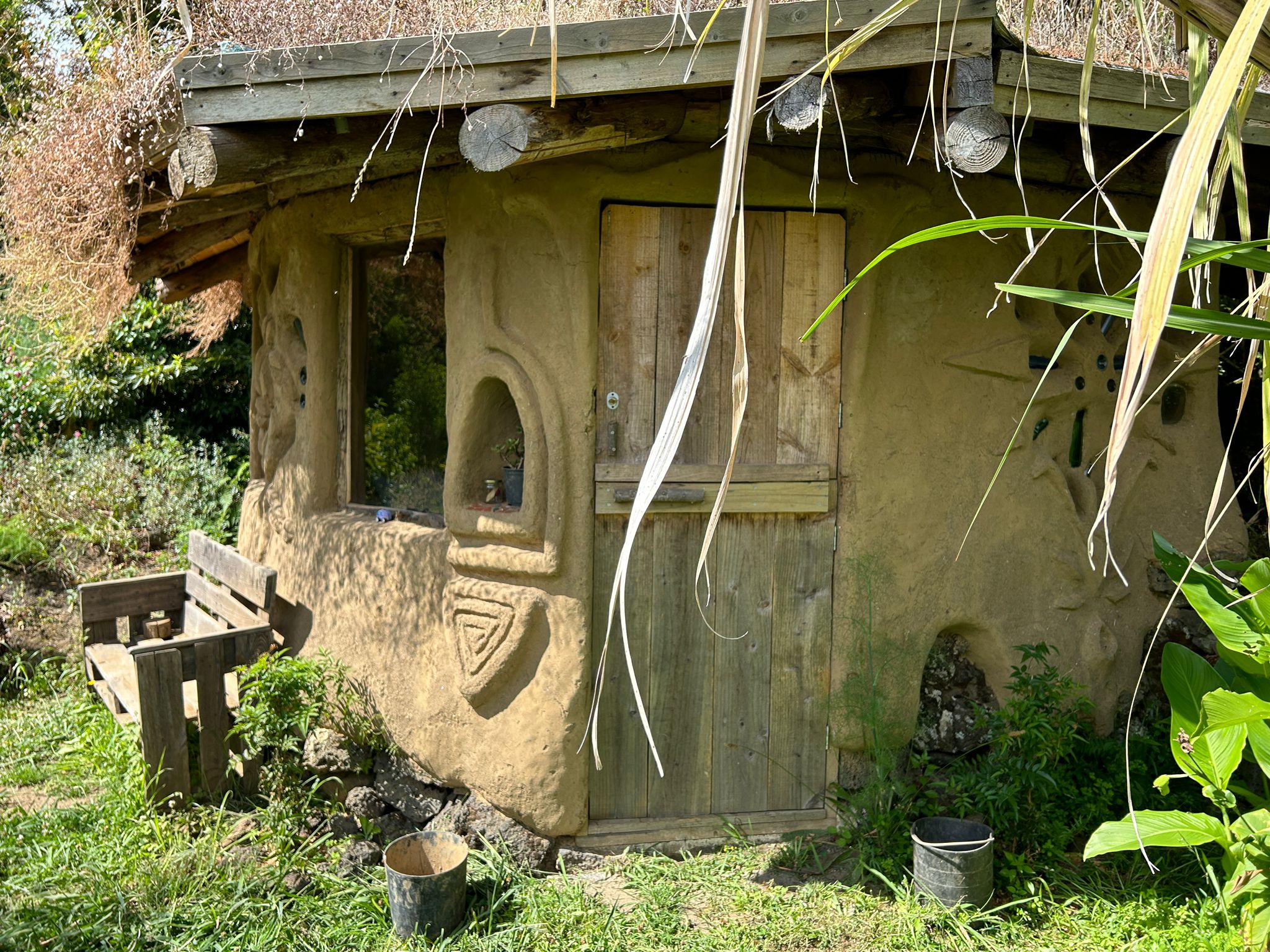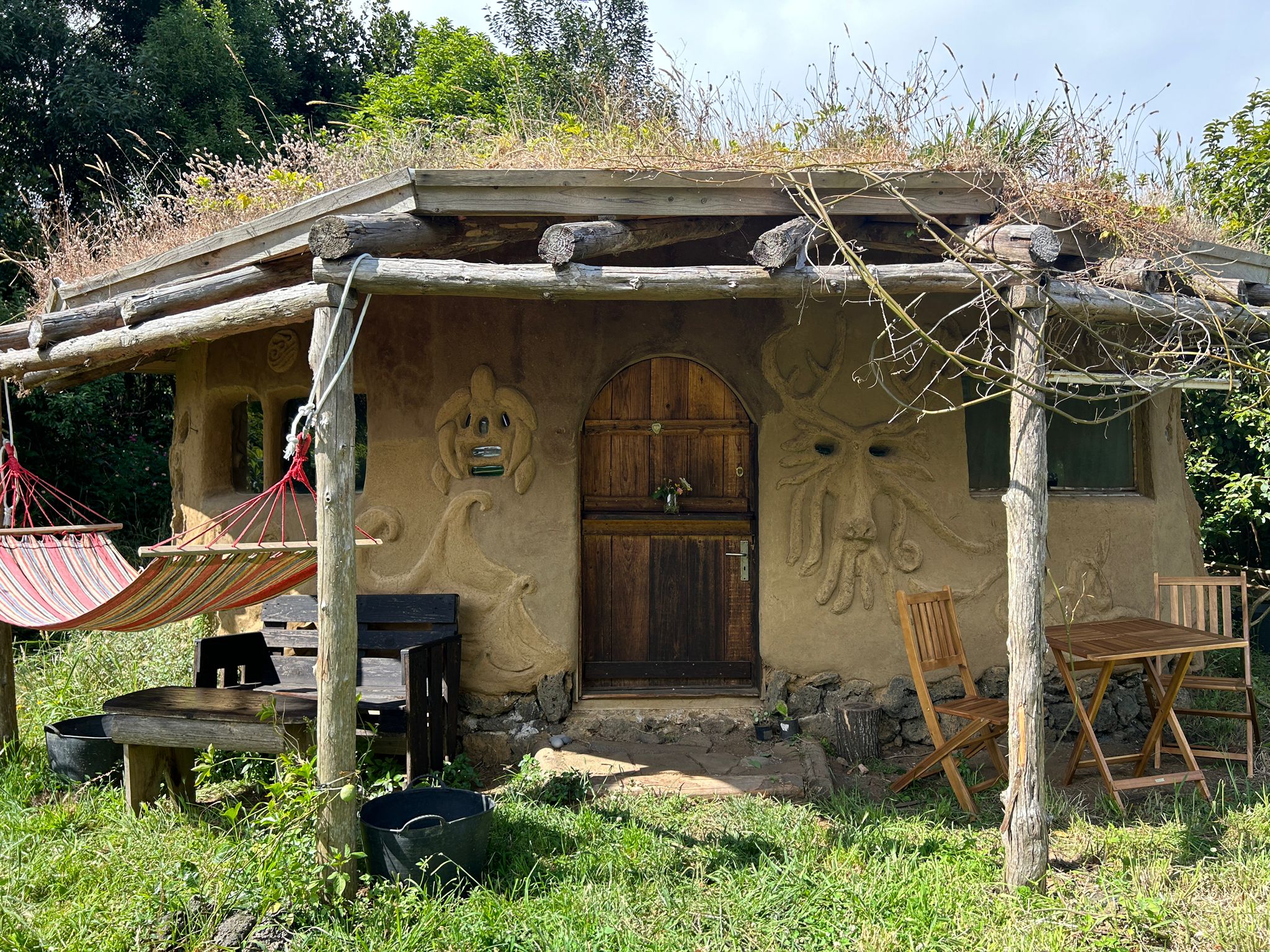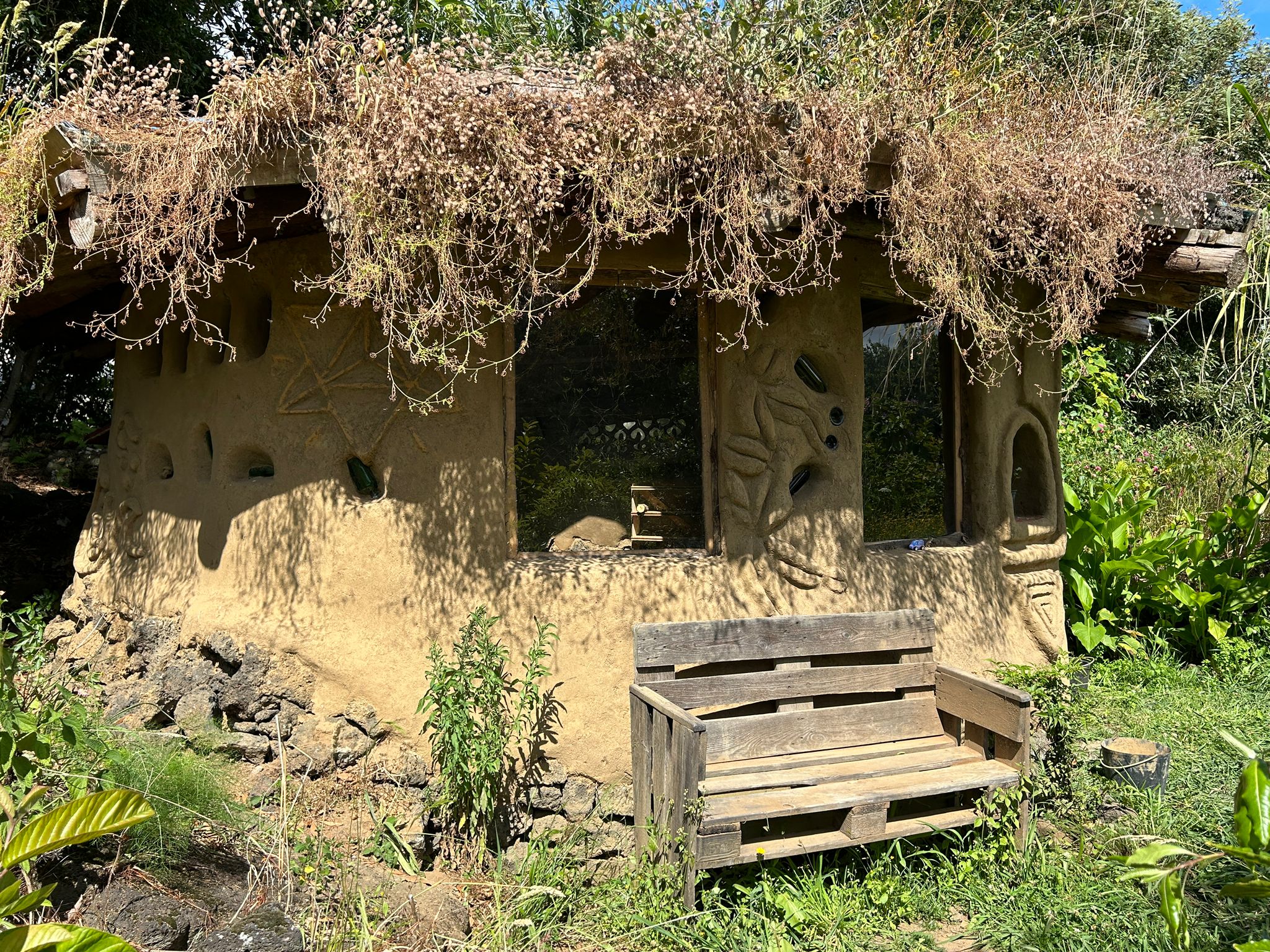 Each one is unique, beautiful and cozy with its own magic and personal details. They all come with a queen bed with bedding, a desk/table and stool or bench, electrical outlets, lights, night tables and shelves and hooks for your personal items. The Sunset bungalow has a wood-fired rocket heater and the Merkaba bungalow has a woodstove, for the wintertime. Sunrise bungalow has excellent passive solar heating due to its full day full sun exposure, ideal for cob wall thermal absorption duing the daytime hours and release in the evening and night hours. They all 3 have a sink on the outside of the building and outdoor seating. Long-term rentals (30 days or more) are 350€/ month for the Sunrise bungalow and 450€/month for the Sunset and Merkaba bungalows.